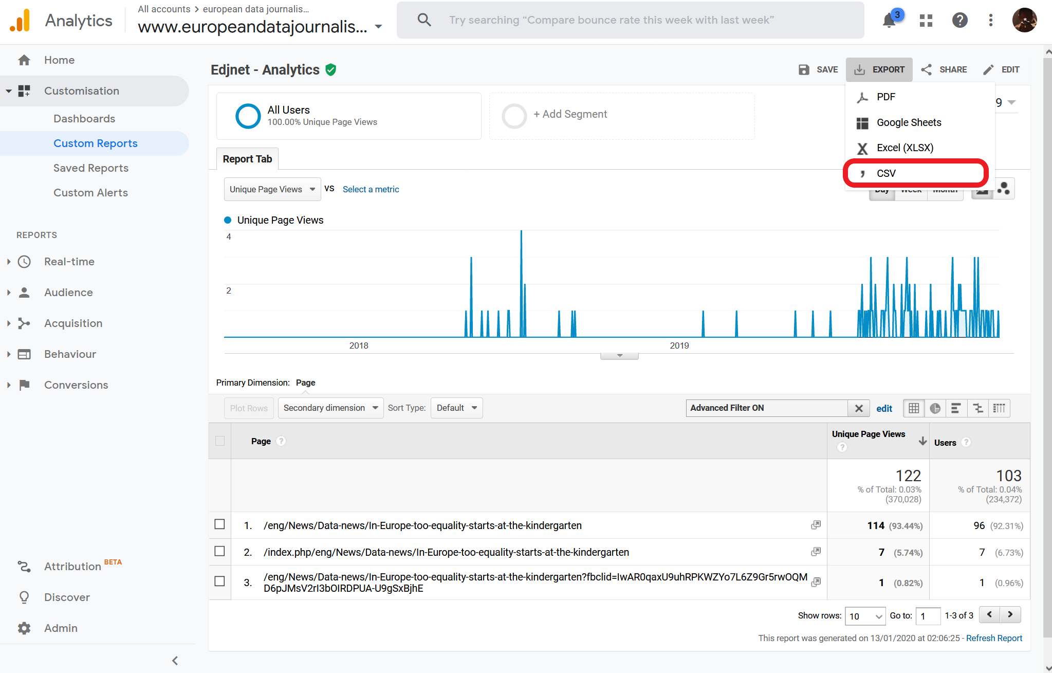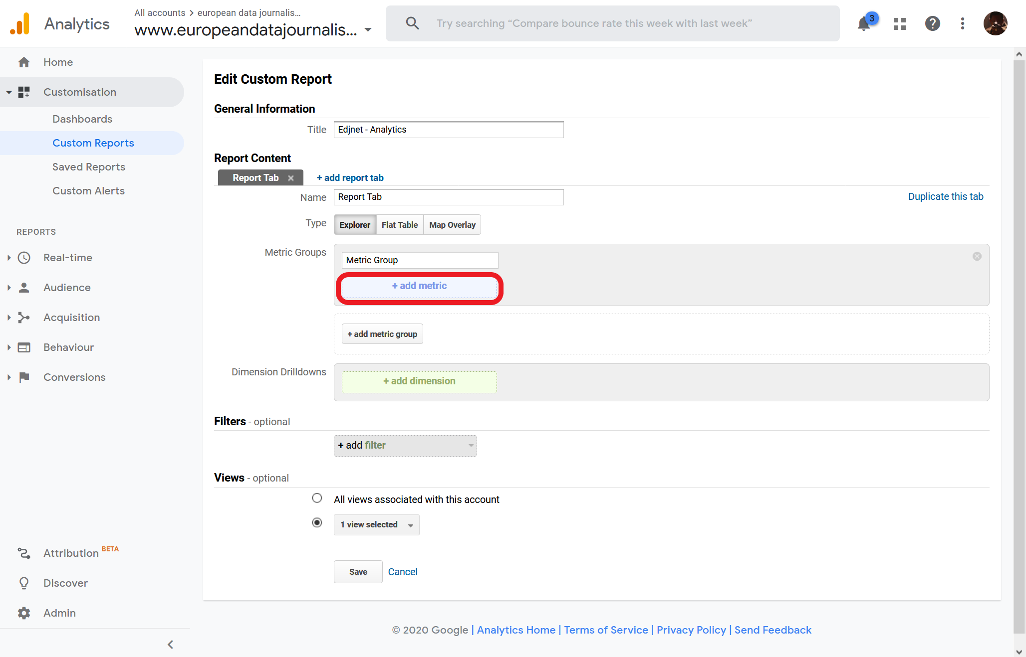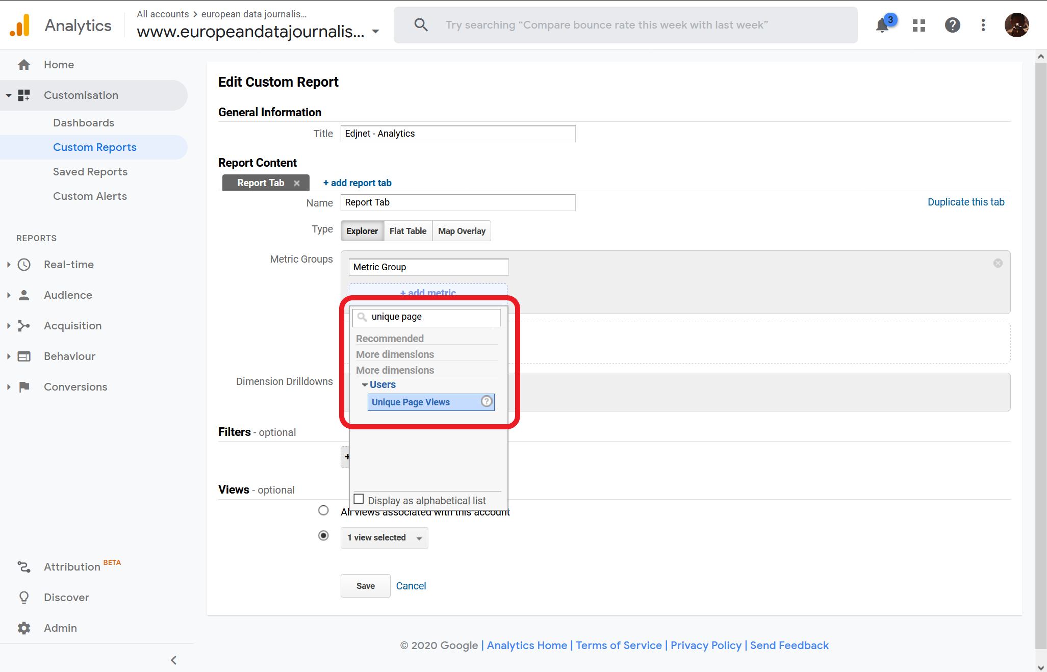 From the main Google Analytics page of your organization press "Custom Reports" from